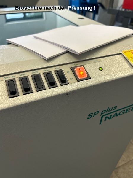 Broschüren bis zu 224 Seiten/56 Blatt produziert werden. Die Lagen werden manuell zugeführt. Alle Maschineneinstellungen, wie Broschürenstärke, Format, Anzahl der Heftungen (bis zu 6) und Stärke der